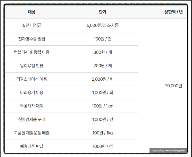 | 실천 항목 | 전자영수증 발급, 텀블러/다회용컵 이용, 일회용컵 반납, 리필스테이션 이용, 다회용기 이용, 무공해차 대여, 친환경제품 구매, 고품질 재활용품 배출, 폐휴대폰 반납, 미래세대 실천 행동 |